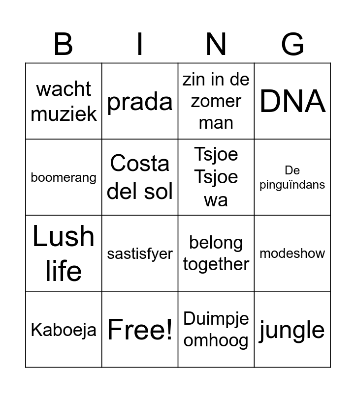 This bingo card has 28 words: Anne-Fleur vakantie, Summer, Lush life, ijsjes, Costa del sol, zin in de zomer man, prada, jungle, Free!, these words, belong together, DNA, Waar is da feestje, Mango Mango, sastisfyer, Het Vliegerlied, Dans met tante Rita, Tsjoe Tsjoe wa, De pinguïndans, kabouterdans, wacht muziek, Europapa, Kaboeja, modeshow, Duimpje omhoog, Me&My selfie, boomerang and Landen op Ibiza.