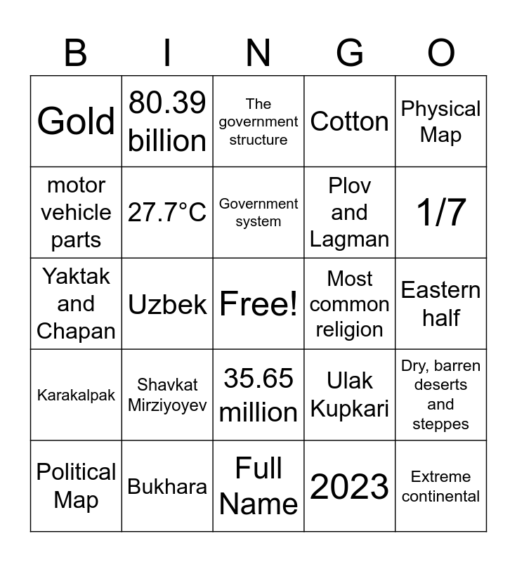 This bingo card has a free space and 25 words: Shavkat Mirziyoyev, Full Name, Government system, Political Map, Physical Map, Gold, motor vehicle parts, 80.39 billion, Most common religion, 35.65 million, Plov and Lagman, Yaktak and Chapan, Ulak Kupkari, Dry, barren deserts and steppes, 27.7°C, -2°C, Eastern half, The government structure, 1/7, Uzbek, Extreme continental, Bukhara, Karakalpak, Cotton and 2023.