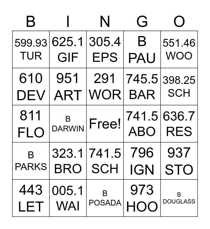 This bingo card has a free space and 24 words: 323.1 BRO, 005.1 WAI, 291 WOR, 443 LET, 551.46 WOO, 599.93 TUR, 610 DEV, 625.1 GIF, 741.5 ABO, 741.5 SCH, 745.5 BAR, 811 FLO, 796 IGN, 937 STO, 951 ART, 973 HOO, 636.7 RES, 305.4 EPS, 398.25 SCH, B DARWIN, B DOUGLASS, B PARKS, B PAU and B POSADA.