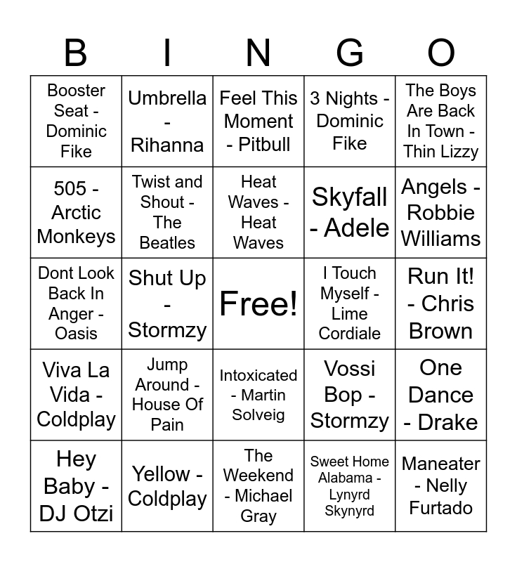 This bingo card has a free space and 78 words: Give Me Everything - Pitbull, Timber - Pitbull, Feel This Moment - Pitbull, International Love - Pitbull, So What - P!NK, Confidence - Ocean Alley, Double Vision - Ocean Alley, Wild Ones - Flo Rida, Drive By - Train, Californication - Red Hot Chilli Peppers, Feel Good Inc - Gorillaz, Bounce - Calvin Harris, 3 Nights - Dominic Fike, Booster Seat - Dominic Fike, Cant Get You Out Of My Head - Kylie Minogue, 505 - Arctic Monkeys, Fergalicious - Fergie, Jump Around - House Of Pain, Dreams - Fleetwood Mac, Run It! - Chris Brown, When You Were Young - The Killers, The Boys Are Back In Town - Thin Lizzy, Dont Look Back In Anger - Oasis, Heat Waves - Heat Waves, Twist and Shout - The Beatles, Livin La Vida Loca - Ricky Martin, Untouched - Veronicas, Good Vibrations - Marky Mark and The Funky Bunch, I Wanna Dance With Somebody - Whitney Houston, Sicko Mode - Travis Scott, Angels - Robbie Williams, Lose Yourself - Eminem, The Weekend - Michael Gray, What You Waiting For? - Gwen Stefani, Hey Baby - DJ Otzi, I Touch Myself - Lime Cordiale, DJ Got Us Falling In Love - Usher, Pumped Up Kicks - Foster The People, Hey, Soul Sister - Train, Maneater - Nelly Furtado, Temperature - Sean Paul, Get Busy - Sean Paul, Jimmy Recard - Drapht, Rapunzel - Drapht, Breakfast At Tiffanys - Deep Blue Something, Umbrella - Rihanna, Hey Ya - Outkast, Party In The USA - Miley Cyrus, Rockstar - Nickelback, How You Remind Me - Nickelback, One Dance - Drake, Shut Up - Stormzy, Vossi Bop - Stormzy, What Do You Mean? - Justin Bieber, Someone You Loved - Lewis Capaldi, I Got U - Duke Dumont, Whats Up? - 4 Non Blondes, Send Me On My Way - Rusted Root, Money For Nothing - Dire Straits, Intoxicated - Martin Solveig, Skyfall - Adele, Friday I'm In Love - The Cure, I Gotta Feeling - Black Eyed Peas, Dont You Worry Child - Swedish House Mafia, Do It Right - Martin Solveig, Two Prines - Spin Doctors, Firework - Katy Perry, Sweet But Psycho - Ava Max, Viva La Vida - Coldplay, Yellow - Coldplay, We Are Your Friends - Justice, You're The Voice - John Farnham, Turn Me on - Riton, Leave (Get Out) - JoJo, Sweet Home Alabama - Lynyrd Skynyrd, The Lion Sleeps Tonight - The Tokens, Respect - Aretha Franklin and Stolen Dance.