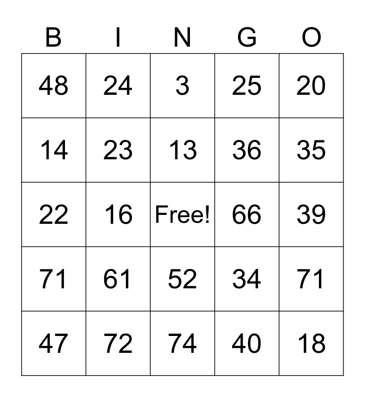 This bingo card has a free space and 75 words: 1, 2, 3, 4, 5, 6, 7, 8, 9, 10, 11, 12, 13, 14, 15, 16, 17, 18, 19, 20, 21, 22, 23, 24, 25, 26, 27, 28, 29, 30, 31, 32, 33, 34, 35, 36, 37, 38, 39, 40, 41, 42, 43, 44, 45, 46, 47, 48, 49, 50, 51, 52, 53, 54, 55, 56, 57, 58, 59, 60, 61, 62, 63, 64, 65, 66, 67, 68, 69, 71, 71, 72, 73, 74 and 75.
