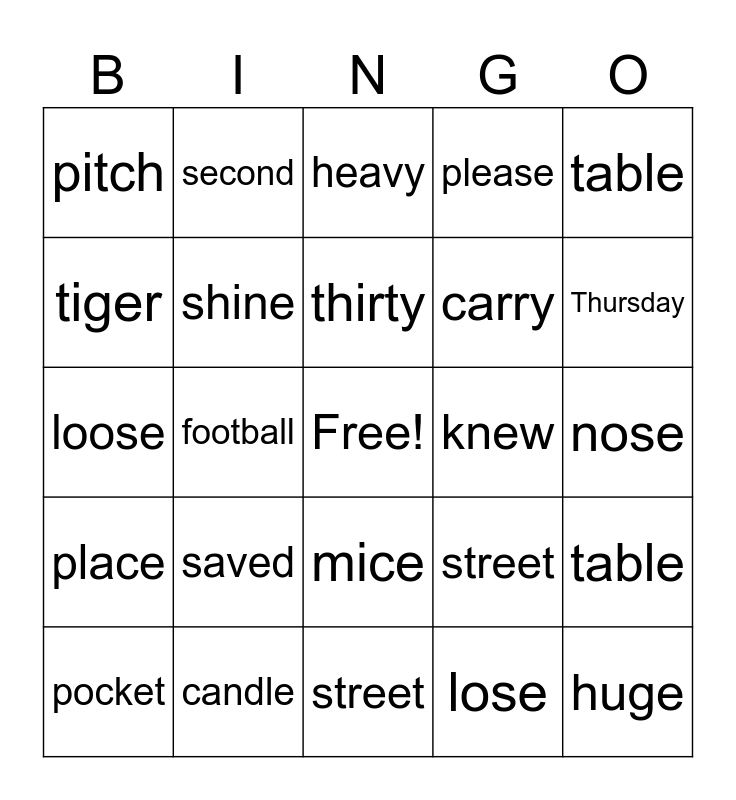 This bingo card has a free space and 24 words: saved, candle, thirty, pocket, table, pitch, tiger, second, knew, mice, carry, loose, street, table, shine, lose, nose, heavy, Thursday, football, huge, place, please and street.