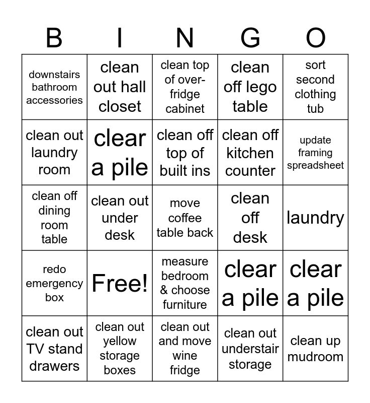 This bingo card has 25 words: Free!, clean out and move wine fridge, clean off top of built ins, clean out TV stand drawers, sort second clothing tub, downstairs bathroom accessories, clean out laundry room, clean out hall closet, clean off desk, measure bedroom & choose furniture, clean off kitchen counter, clean off dining room table, clear a pile, clear a pile, clear a pile, clean up mudroom, laundry, clean top of over-fridge cabinet, update framing spreadsheet, clean out under desk, move coffee table back, clean out yellow storage boxes, redo emergency box, clean off lego table and clean out understair storage.