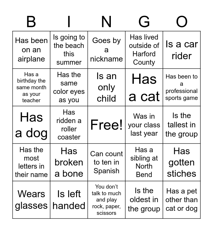 This bingo card has a free space and 24 words: Has broken a bone, Is left handed, Is an only child, Wears glasses, Is a car rider, Has been on an airplane, Has a birthday the same month as your teacher, Is going to the beach this summer, Was in your class last year, Can count to ten in Spanish, Has a cat, Has a dog, Has a sibling at North Bend, Has gotten stiches, Has the same color eyes as you, Is the oldest in the group, Is the tallest in the group, Goes by a nickname, Has been to a professional sports game, Has ridden a roller coaster, Has a pet other than cat or dog, Has the most letters in their name, Has lived outside of Harford County and You don’t talk to much and play rock, paper, scissors.