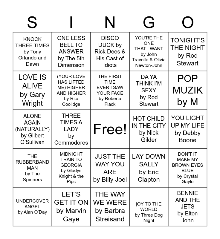 This bingo card has a free space and 100 words: HOW DEEP IS YOUR LOVE by Bee Gees, I JUST WANT TO BE YOUR EVERYTHING by Andy Gibb, YOU LIGHT UP MY LIFE by Debby Boone, LE FREAK by Chic, STAYIN’ ALIVE by Bee Gees, Y.M.C.A. by Village People, SHADOW DANCING by Andy Gibb, HOT STUFF by Donna Summer, NIGHT FEVER by Bee Gees, RAINDROPS KEEP FALLIN’ ON MY HEAD by B.J. Thomas, BEST OF MY LOVE by The Emotions, I WILL SURVIVE by Gloria Gaynor, (LOVE IS) THICKER THAN WATER by Andy Gibb, LET’S GET IT ON by Marvin Gaye, KISS YOU ALL OVER by Exile, A FIFTH OF BETHOVEN by Walter Murphy & The Big Apple Band, DA YA THINK I’M SEXY by Rod Stewart, EVERGREEN (LOVE THEME FROM A STAR IS BORN) by Barbra Streisand, BOOGIE OOGIE OOGIE by A Taste of Honey, AMERICAN PIE by Don McLean, MY SHARONA by The Knack, TIE A YELLOW RIBBON ROUND THE OLE OAK TREE by Tony Orlando and Dawn", TOUCH ME IN THE MORNING by Diana Ross, I THINK I LOVE YOU by the Partridge Family, I’LL BE THERE by The Jackson 5, HOT CHILD IN THE CITY by Nick Gilder, TONIGHT’S THE NIGHT by Rod Stewart, LAY DOWN SALLY by Eric Clapton, I GO CRAZY by Paul Davis, PLAY THAT FUNKY MUSIC by Wild Cherry, THREE TIMES A LADY by Commodores, KNOCK THREE TIMES by Tony Orlando and Dawn, LET IT BE by The Beatles, RHINESTONE COWBOY by Glen Campbell, jOY TO THE WORLD by Three Dog Night, THE FIRST TIME EVER I SAW YOUR FACE by Roberta Flack, DON’T IT MAKE MY BROWN EYES BLUE by Crystal Gayle, A LITTLE MORE LOVE by Olivia Newton-John, BABY COME BACK by Player, PHILADELPHIA FREEDOM by Elton John, STILL by Commodores, SAD EYES by Robert John, ALONE AGAIN (NATURALLY) by Gilbert O’Sullivan, BAD GIRLS by Donna Summer, POP MUZIK by M, DISCO DUCK by Rick Dees & His Cast of Idiots, BOOGIE NIGHTS by Heatwave, I WRITE THE SONGS by Barry Manilow, I GOTCHA by Joe Tex, THE WAY WE WERE by Barbra Streisand, IT’S TOO LATE/I FEEL THE EARTH MOVE by Carole King, RING MY BELL by Anita Ward, YOU MAKE ME FEEL LIKE DANCING by Leo Sayer, SILLY LOVE SONGS by Wings, (THEY LONG TO BE) CLOSE TO YOU by The Carpenters, I WANT YOU BACK by The Jackson 5, MAGGIE MAY/REASON TO BELIEVE by Rod Stewart, REUNITED by Peaches & Herb, YOU NEEDED ME by Anne Murray, YOU’RE THE ONE THAT I WANT by John Travolta & Olivia Newton-John, EMOTION by Samantha Sang, I’LL NEVER LOVE THIS WAY AGAIN by Dionne Warwick, TOO MUCH HEAVEN by Bee Gees, DON’T LEAVE ME THIS WAY by Thelma Houston, YOU’RE SO VAIN by Carly Simon, KEEP ON TRUCKIN’ by Eddie Kendricks, LOVE THE NIGHTLIFE by Alicia Bridges, IF YOU LEAVE ME NOW by Chicago, LOVE MACHINE by The Miracles, I LIKE DREAMIN’ by Kenny Nolan, I CAN’T SMILE WITHOUT YOU by Barry Manilow, MIDNIGHT TRAIN TO GEORGIA by Gladys Knight & the Pips, YOU DON’T BRING ME FLOWERS by Neil Diamond & Barbra Streisand, MACARTHUR PARK by Donna Summer, (SHAKE, SHAKE, SHAKE) SHAKE YOUR BOOTY by KC and the Sunshine Band, IF I CAN’T HAVE YOU by Yvonne Elliman, RISE by Herb Alpert, LOVE IS ALIVE by Gary Wright, BRIDGE OVER TROUBLED WATER by Simon & Garfunkel, BRAND NEW KEY by Melanie, INDIAN RESERVATION (THE LAMENT OF THE CHEROKEE RESERVATION INDIAN) y Paul Revere & the Raiders, BENNIE AND THE JETS by Elton John, WE’VE ONLY JUST BEGUN by The Carpenters, JUST THE WAY YOU ARE by Billy Joel, YOU DON’T HAVE TO BE A STAR (TO BE IN MY SHOW) by Marilyn McCoo & Billy Davis Jr., ONE LESS BELL TO ANSWER by The 5th Dimension, SOMEDAY WE’LL BE TOGETHER by Diana Ross & the Supremes, BAD, BAD LEROY BROWN by Jim Croce, LEAVING ON A JET PLANE by Peter, Paul and Mary, THE RUBBERBAND MAN by The Spinners, ANGEL IN YOUR ARMS by Hot, LOVE WILL KEEP US TOGETHER by Captain & Tennille, KISS AND SAY GOODBYE by The Manhattans, UNDERCOVER ANGEL by Alan O’Day, (YOUR LOVE HAS LIFTED ME) HIGHER AND HIGHER by Rita Coolidge, FIRE by The Pointer Sisters, MISS YOU by The Rolling Stones, BRANDY (YOU’RE A FINE GIRL) by Looking Glass, DANCING MACHINE by The Jackson 5 and MY SWEET LORD/ ISN’T IT A PITY by George Harrison.