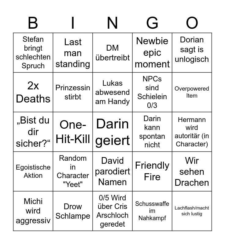 This bingo card has a free space and 24 words: Random in Character "Yeet", Drow Schlampe, Lukas abwesend am Handy, Michi wird aggressiv, Dorian sagt is unlogisch, Stefan bringt schlechten Spruch, 2x Deaths, Last man standing, Darin kann spontan nicht, David parodiert Namen, NPCs sind Schielein 0/3, „Bist du dir sicher?“, Friendly Fire, Wir sehen Drachen, Prinzessin stirbt, Schusswaffe im Nahkampf, Hermann wird autoritär (in Character), DM übertreibt, Overpowered Item, One-Hit-Kill, Lachflash/macht sich lustig, Egoistische Aktion, Newbie epic moment and 0/5 Wird über Cris Arschloch geredet.