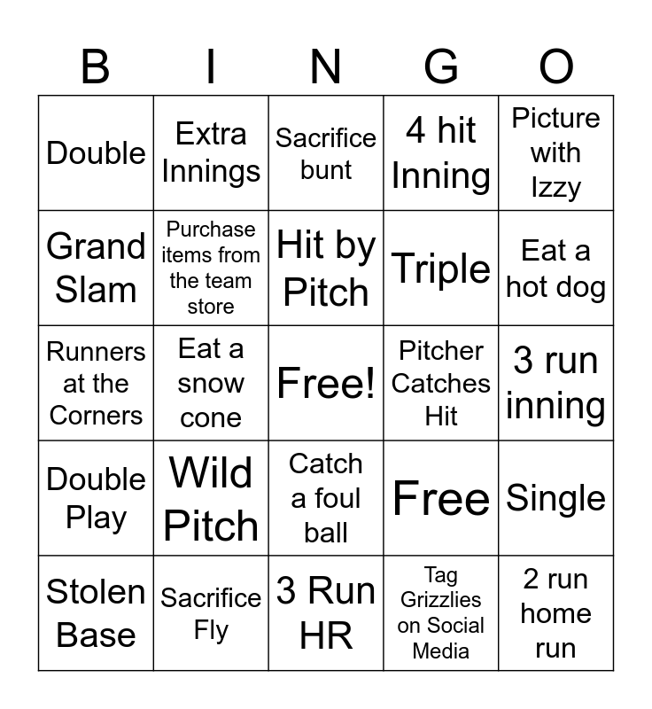 This bingo card has a free space and 25 words: Wild Pitch, 3 Run HR, Hit by Pitch, Stolen Base, Picture with Izzy, Double, Grand Slam, Extra Innings, Pitcher Catches Hit, Catch a foul ball, Triple, Runners at the Corners, Free, Single, Purchase items from the team store, Solo home run, 3 run inning, Sacrifice bunt, Eat a hot dog, Eat a snow cone, 2 run home run, Sacrifice Fly, Double Play, 4 hit Inning and Tag Grizzlies on Social Media.