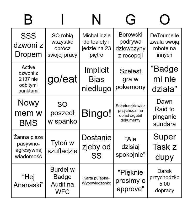 This bingo card has a free space and 59 words: Leśniak mówi "Na spokojnie”, Burdel w Badge Audit na WFC, Podwójne espresso z potrójnym espresso, Żanna pisze pasywno-agresywną wiadomość, "Pięknie prosimy o approve", Katarzyna robi checka, go/eat, Schabowy z Janexa, Szelest gra w pokemony, Kornaga się spóźni, Borowski podrywa dziewczyny z recepcji, Wyjebało istar, Active dzwoni z 2137 nie odbitymi punktami, Bartek mówi jak iwona, SSC kręci badgami, SSS dzwoni z Dropem, Darek przychodziło 5:00 dopracy, DeTournelle zwala swoją robotę na innych, Bramson opowiada suchy żart, Implicit Bias niedługo, Sołoduszkiewicz przychodzi na obiad /zgubił dokumenty, Michał idzie do toalety i jedzie na 23 piętro, “Hej Ananaski”, Super Task z dupy, Maciej mówi “Przyjąłem”, SSC się opierdala aż miło, Wyjebało Exit Guarda, Test AG czyli przyjebanie nim o cokolwiek, “Badge mi nie działa”, Wczorajsze jedzenie na obiedzie, Facility robi problemy z dupy, Znowu nie ma badga dla Ever Cleaning, Pół kuchni zapierdala na visitorze, Bułka przypierdala się o bzdury, SO robią wszystko oprócz swojej pracy, Komentarz “proszę o wypełnienie/uzupełnienie”, Badging chat jest upośledzony, SO poszedł w spanko, Ktoś przypadkiem napisał na czacie z GSOC lub SSC, Nowy mem w BMS, Odznaka suchego Bramsona za 4 suchary, Tytoń w szufladzie, Dawn Raid to pinganie sundara, “Trzeba sobie jakoś radzić”, Piesek na KONJ, GSOC pisze z jakąś randomową manifestacją na mieście, Wpisanie prywatnej wiadomości na publicznym chacie, Darek dzwoni o 23 pomimo braku zmiany, Dostanie zjeby od SS, Karta pułapka- Wypowiedzonko, “O, Bułka dziś”, Kanapka “sushi januszi”, Do dropa na WFC dodajemy obiad., Odsprzedam dropa, Kupie L4 na najblizszy tydzien, “Ale dzisiaj spokojnie”, “Ach ten Pimpel”, Ania mówi “LOL” and Natychmiastowy Offboarding.