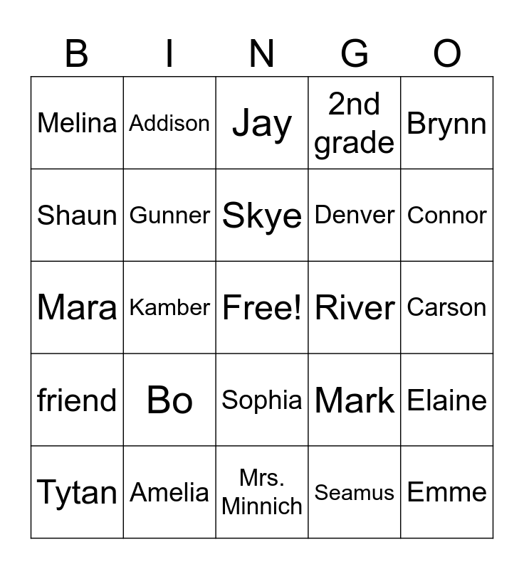 This bingo card has a free space and 24 words: Bo, Amelia, Skye, Tytan, Brynn, Melina, Shaun, Addison, River, Sophia, Denver, Mara, Mark, Elaine, Gunner, Seamus, Carson, Jay, Connor, Kamber, Emme, friend, 2nd grade and Mrs. Minnich.