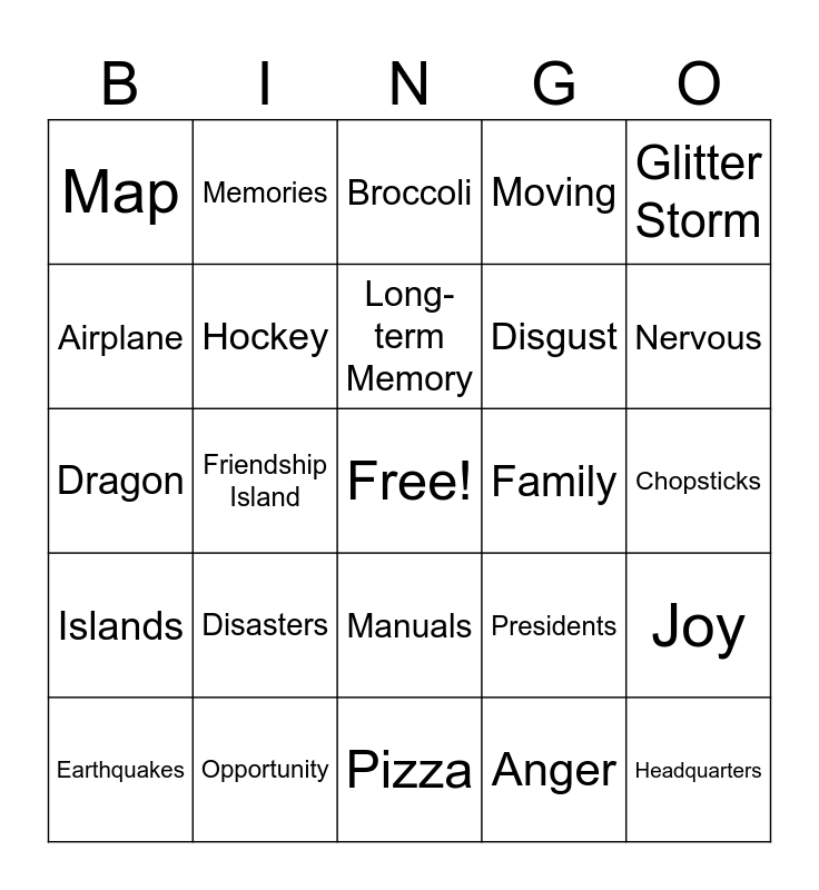 This bingo card has a free space and 28 words: Joy, Fear, Disgust, Anger, Airplane, Broccoli, Memories, Islands, Family, Earthquakes, Dragon, Moving, Opportunity, Pizza, Nervous, Cool Girls, Disasters, Hockey, Long-term Memory, Manuals, Map, Sad, Headquarters, Friendship Island, Chopsticks, Presidents, Glitter Storm and Riley.