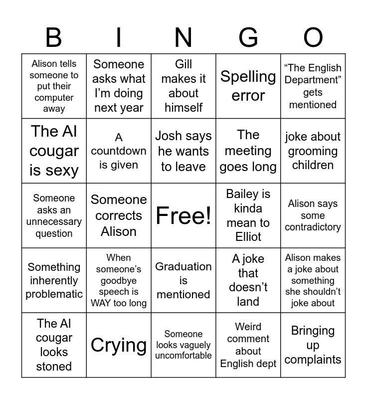 This bingo card has a free space and 24 words: When someone’s goodbye speech is WAY too long, Crying, Josh says he wants to leave, The AI cougar looks stoned, “The English Department” gets mentioned, Alison tells someone to put their computer away, The AI cougar is sexy, Someone asks what I’m doing next year, Bailey is kinda mean to Elliot, Graduation is mentioned, The meeting goes long, Someone asks an unnecessary question, A joke that doesn’t land, Alison makes a joke about something she shouldn’t joke about, A countdown is given, Weird comment about English dept, Alison says some contradictory, Gill makes it about himself, joke about grooming children, Someone corrects Alison, Bringing up complaints, Something inherently problematic, Spelling error and Someone looks vaguely uncomfortable.