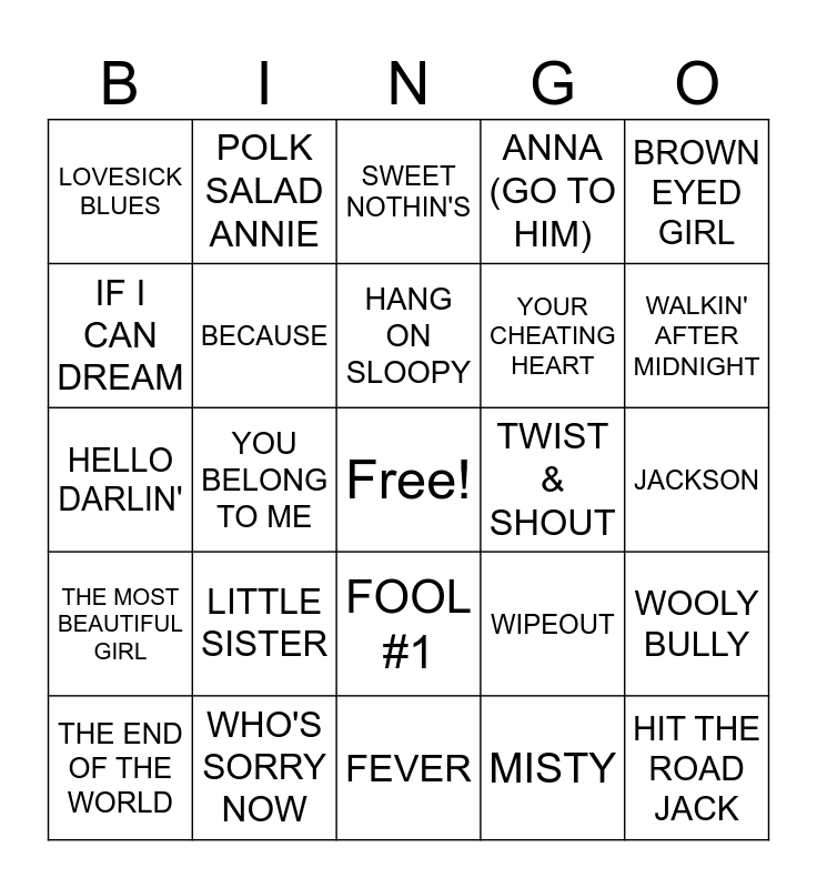 This bingo card has a free space and 50 words: YOU DON'T KNOW ME, HIT THE ROAD JACK, IT'S NOW OR NEVER, FEVER, LITTLE SISTER, RETURN TO SENDER, POLK SALAD ANNIE, STAYIN' ALIVE, IF I CAN DREAM, I'LL FOLLOW THE SUN, BECAUSE, ANNA (GO TO HIM), WOOLY BULLY, WIPEOUT, SHE LOVES YOU, BE MY BABY, HANG ON SLOOPY, TWIST & SHOUT, I SAW HER STANDING THERE, BROWN EYED GIRL, YOU BELONG TO ME, MISTY, LOVESICK BLUES, YOUR CHEATING HEART, LEAVIN' ON YOUR MIND, CRAZY, WALKIN' AFTER MIDNIGHT, JAMBALAYA, SWEET NOTHIN'S, FOOL #1, LOSING YOU, YOU NEVER CAN TELL, LIPSTICK ON YOUR COLLAR, CRYIN' IN THE CHAPEL, WHO'S SORRY NOW, STUPID CUPID, AMONG MY SOUVENIRS, FOR THE GOOD TIMES, HELP ME MAKE IT THROUGH THE NIGHT, JACKSON, I WALK THE LINE, RING OF FIRE, A BOY NAMED SUE, STAND BY YOUR MAN, THE END OF THE WORLD, HELLO DARLIN', HE'LL HAVE TO GO, I CAN'T STOP LOVIN' YOU, THE MOST BEAUTIFUL GIRL and HARPER VALLEY P.T.A..