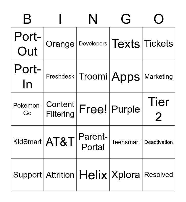 This bingo card has a free space and 25 words: AT&T, Helix, Troomi, Support, Tickets, Port-Out, Port-In, Orange, Purple, Parent-Portal, Apps, Pokemon-Go, Teensmart, Deactivation, Freshdesk, Tier 1, Tier 2, Developers, Marketing, Content Filtering, Resolved, Attrition, KidSmart, Texts and Xplora.