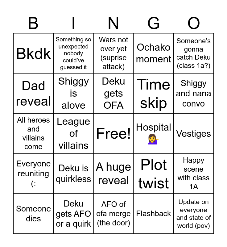 This bingo card has a free space and 24 words: Deku is quirkless, Deku gets AFO or a quirk, Deku gets OFA, Someone dies, Someone’s gonna catch Deku (class 1a?), Bkdk, Dad reveal, Something so unexpected nobody could’ve guessed it, Hospital 💁♀️, A huge reveal, Time skip, All heroes and villains come, Plot twist, Happy scene with class 1A, Shiggy is alove, Flashback, Vestiges, Wars not over yet (suprise attack), Shiggy and nana convo, League of villains, Update on everyone and state of world (pov), Everyone reuniting (:, Ochako moment and AFO of ofa merge (the door).