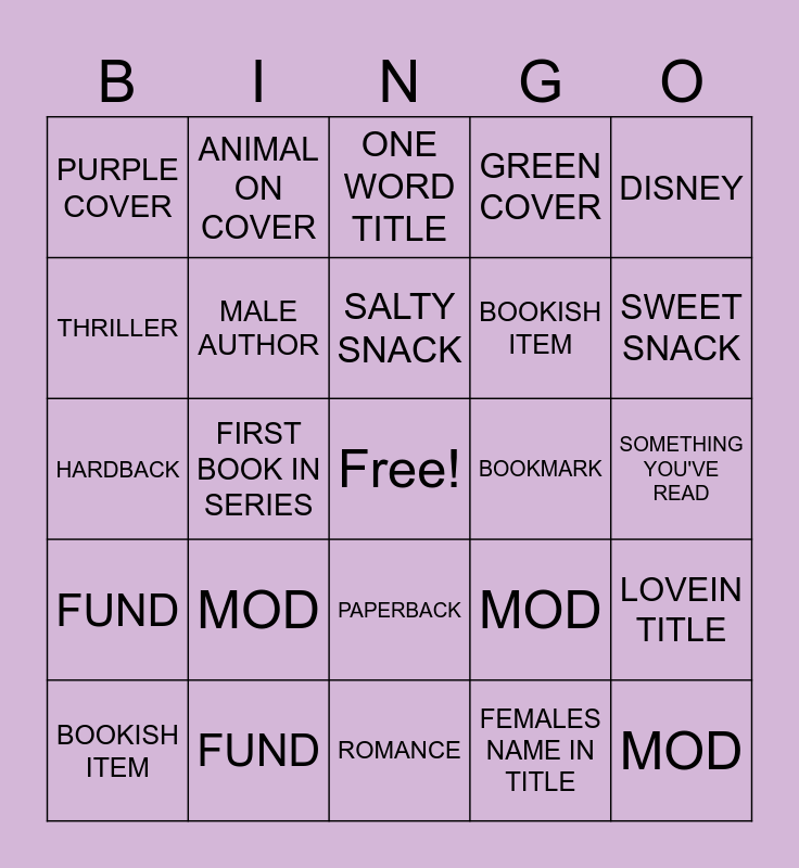 This bingo card has a free space and 24 words: MOD, FUND, SALTY SNACK, BOOKISH ITEM, DISNEY, PURPLE COVER, THRILLER, ANIMAL ON COVER, BOOKMARK, PAPERBACK, BOOKISH ITEM, HARDBACK, MOD, LOVEIN TITLE, MALE AUTHOR, FEMALES NAME IN TITLE, SOMETHING YOU'VE READ, ONE WORD TITLE, SWEET SNACK, FIRST BOOK IN SERIES, MOD, FUND, GREEN COVER and ROMANCE.