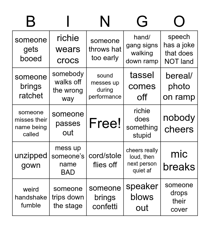 This bingo card has a free space and 24 words: mess up someone’s name BAD, someone trips down the stage, sound messes up during performance, weird handshake fumble, speech has a joke that does NOT land, someone gets booed, someone brings ratchet, richie wears crocs, richie does something stupid, cord/stole flies off, tassel comes off, someone misses their name being called, cheers really loud, then next person quiet af, mic breaks, somebody walks off the wrong way, speaker blows out, nobody cheers, someone throws hat too early, bereal/ photo on ramp, someone passes out, someone drops their cover, unzipped gown, hand/ gang signs walking down ramp and someone brings confetti.