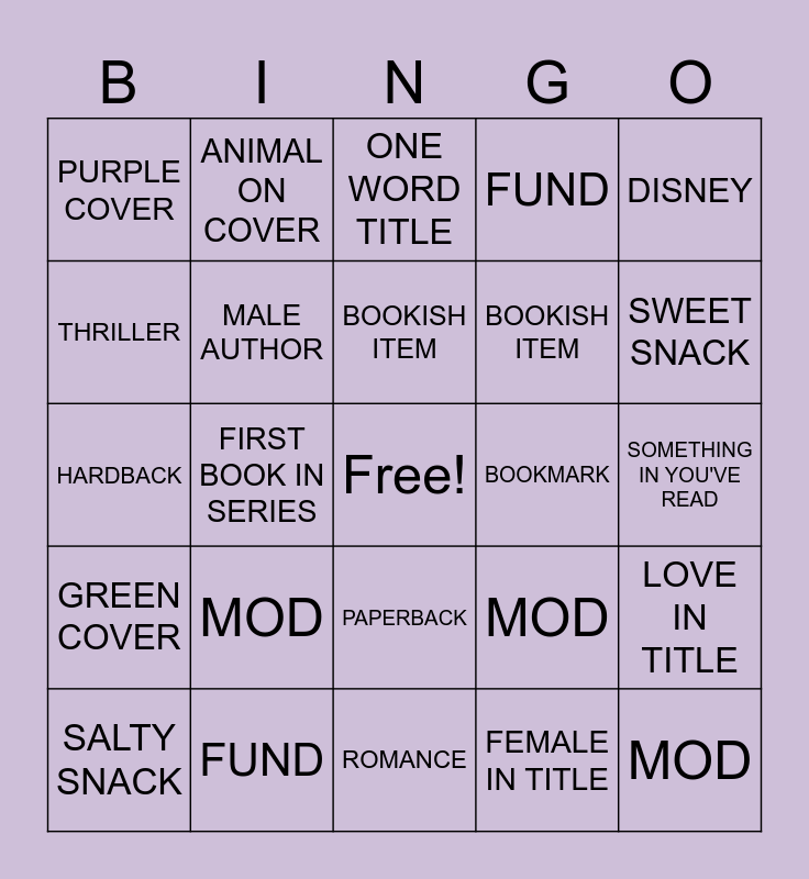 This bingo card has a free space and 24 words: MOD, FUND, BOOKISH ITEM, SALTY SNACK, DISNEY, PURPLE COVER, THRILLER, ANIMAL ON COVER, BOOKMARK, PAPERBACK, BOOKISH ITEM, HARDBACK, MOD, LOVE IN TITLE, MALE AUTHOR, FEMALE IN TITLE, SOMETHING IN YOU'VE READ, ONE WORD TITLE, SWEET SNACK, FIRST BOOK IN SERIES, MOD, GREEN COVER, FUND and ROMANCE.