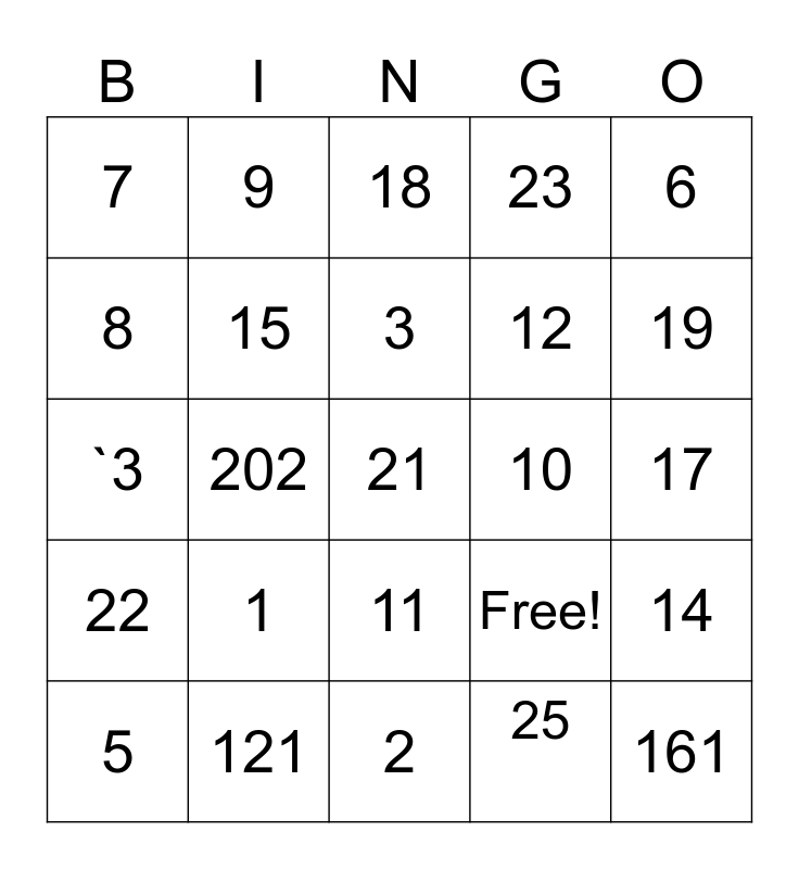 This bingo card has 25 words: 1, 2, 3, 5, 6, 7, 8, 9, 10, 11, 12, `3, Free!, 14, 15, 161, 17, 18, 19, 202, 21, 121, 22, 23 and 25.