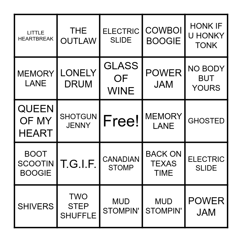 This bingo card has a free space and 28 words: ELECTRIC SLIDE, BOOT SCOOTIN' BOOGIE, POWER JAM, MUD STOMPIN', MEMORY LANE, ELECTRIC SLIDE, THE OUTLAW, BOOT SCOOTIN BOOGIE, MEMORY LANE, SHIVERS, QUEEN OF MY HEART, COWBOI BOOGIE, TWO STEP SHUFFLE, MUD STOMPIN', NO BODY BUT YOURS, A BAR SONG, T.G.I.F., LONELY DRUM, GLASS OF WINE, CANADIAN STOMP, LITTLE HEARTBREAK, STORM AND STONE, POWER JAM, SHOTGUN JENNY, GHOSTED, BACK ON TEXAS TIME, HONK IF U HONKY TONK and KNOCKIN' BOOTS.