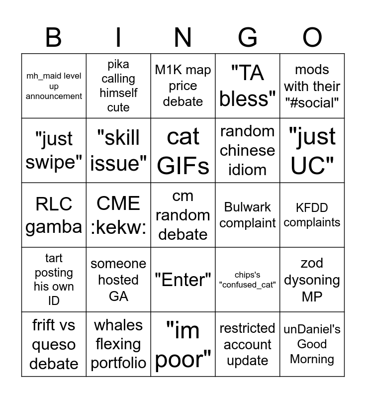 This bingo card has 45 words: Free!, cm random debate, cm poem of the day, frift vs queso debate, skinless fried chicken mention, restricted account update, M1K map price debate, new pin of shame, mods with their "#social", whales flexing portfolio, "TA bless", Bulwark complaint, "Enter", someone hosted GA, mod rig, "im poor", shore discussion, RLC gamba, bzan mapping here, "just UC", pika calling himself cute, ondra and his FTC, someone pinged zapdos, mh_maid level up announcement, cm's AI generated images, KFDD complaints, "CR is 50/50", daily food talk, chips's "confused_cat", tart posting his own ID, UMR's ":jerry:", zod dysoning MP, Hiari using ugly emoji, clover bullied in lounge, lounge can't reading, CME :kekw:, ronza talk, whales mirroring whales, unDaniel's Good Morning, cat GIFs, "just swipe", random chinese idiom, wzyh: "6016437", "skill issue" and hannad pong-ed a victim.