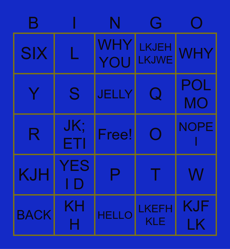 This bingo card has a free space and 25 words: YES I D, HELLO, JELLY, BACK, WHY, SIX, Y, L, O, P, Q, R, T, W, S, HOW ARE YOU, NOPE I, WHY YOU, POL MO, JK; ETI, KJF LK, KH H, KJH, LKJEH LKJWE and LKEFH KLE.