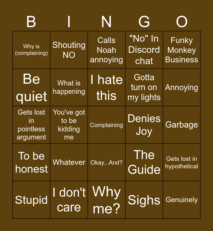 This bingo card has a free space and 24 words: Whatever, I don't care, I hate this, Stupid, Funky Monkey Business, Why is (complaining), Be quiet, Shouting NO, Denies Joy, Okay...And?, Gotta turn on my lights, Gets lost in pointless argument, The Guide, Gets lost in hypothetical, What is happening, Sighs, Garbage, Calls Noah annoying, Annoying, You've got to be kidding me, Genuinely, To be honest, "No" In Discord chat and Why me?.