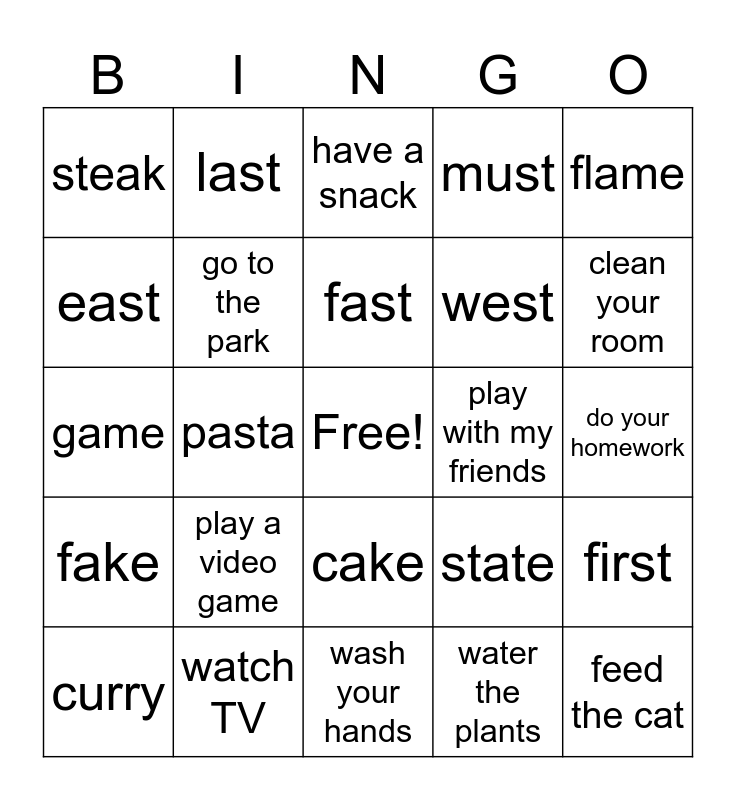 This bingo card has a free space and 29 words: curry, fried rice, pasta, pizza, steak, have a snack, go to the park, play a video game, play with my friends, watch TV, do your homework, feed the cat, wash your hands, water the plants, clean your room, same, cake, fake, flame, game, state, step, west, east, must, last, first, fast and stand.
