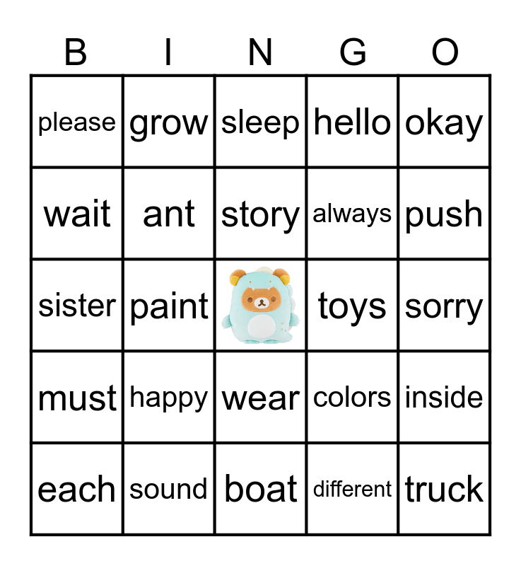 This bingo card has a free space and 80 words: baby, brown, sleep, sun, bear, dry, smell, wet, ask, people, sing, tonight, hello, please, than, wait, brother, happy, sad, sorry, family, okay, sister, story, ant, green, pull, small, fall, hill, push, stop, boat, box, each, toys, bottom, car, middle, truck, flower, ground, path, pink, grew, grow, pick, warm, better, dark, inside, paint, colors, draw, orange, something, air, coat, everyone, wear, always, cool, tomorrow, yesterday, across, lake, listen, quiet, hear, late, must, sound, both, few, group, some, different, gave, left and together.