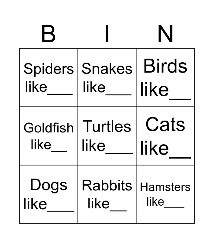 This bingo card has a free space and 8 words: Cats like__, Birds like__, Snakes like___, Dogs like___, Spiders like___, Hamsters like___, Goldfish like__ and Rabbits like__.