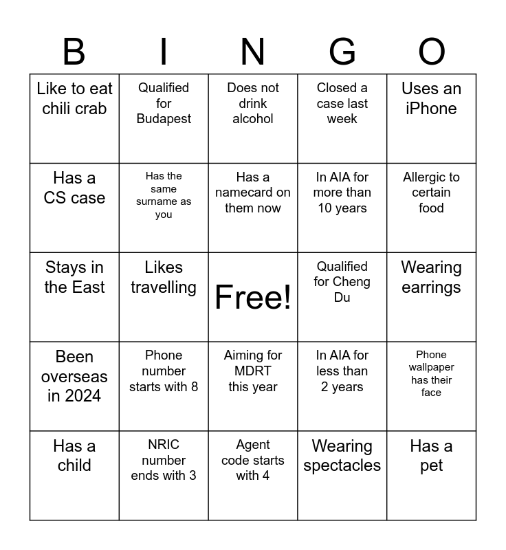 This bingo card has a free space and 24 words: Phone number starts with 8, NRIC number ends with 3, Has a namecard on them now, Has a child, Uses an iPhone, Like to eat chili crab, Has a CS case, Qualified for Budapest, Qualified for Cheng Du, Aiming for MDRT this year, In AIA for more than 10 years, Stays in the East, In AIA for less than 2 years, Phone wallpaper has their face, Has the same surname as you, Wearing spectacles, Wearing earrings, Does not drink alcohol, Allergic to certain food, Likes travelling, Has a pet, Been overseas in 2024, Closed a case last week and Agent code starts with 4.