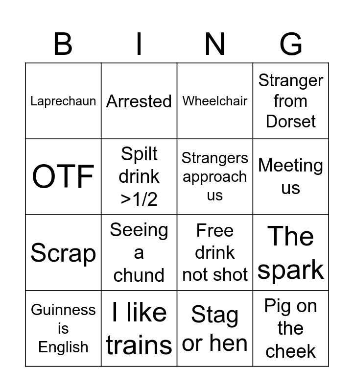 This bingo card has 16 words: I like trains, The spark, Wheelchair, Laprechaun, Scrap, Arrested, Free drink not shot, Stag or hen, OTF, Spilt drink >1/2, Guinness is English, Stranger from Dorset, Seeing a chund, Meeting us, Strangers approach us and Pig on the cheek.