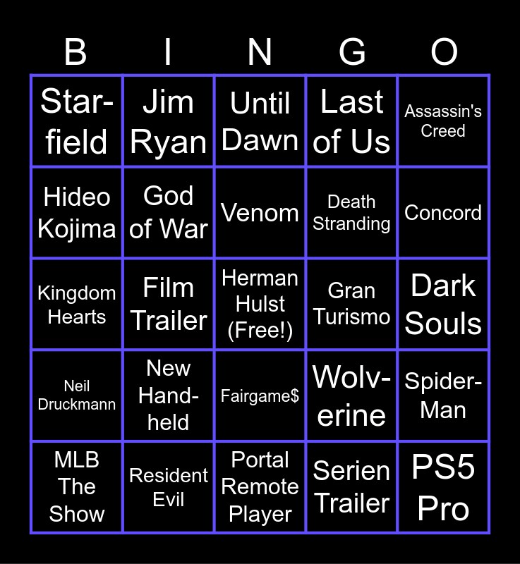This bingo card has a free space and 49 words: PS Plus Abo, PS5 Pro, PS VR2, Portal Remote Player, New Hand- held, Cloud Gaming, Jim Ryan, Hideaki Nishino, Hideo Kojima, Astro Bot, God of War, Last of Us, Spider-Man, Wolv- erine, Ghost of Tushima, Horizon, Venom, Gran Turismo, Elden Ring, Assassin's Creed, Film Trailer, Serien Trailer, Star- field, Death Stranding, Destiny, Concord, MLB The Show, Marathon, Fairgame$, Neil Druckmann, "Kon-nichi-wa", "Sayo-nara", Final Fantasy, Monster Hunter, Resident Evil, Helldivers, Uncharted, Bloodborne, Dark Souls, Silent Hill, Ace Combat, Dragon Quest, Metal Gear Solid, Star Wars, Kingdom Hearts, Until Dawn, Call of Duty, GTA and Persona.