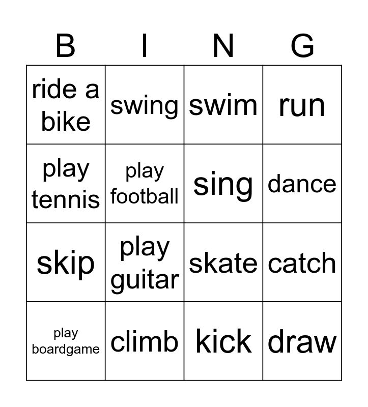 This bingo card has 16 words: climb, catch, swim, ride a bike, skip, swing, skate, kick, play tennis, play football, play boardgame, run, play guitar, dance, sing and draw.