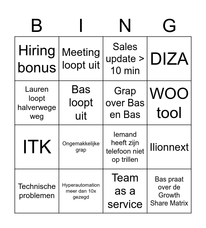 This bingo card has 20 words: Ilionnext, All hands meeting, Sales update > 10 min, Fabian onderbreekt verhaal, Technische problemen, Lauren loopt halverwege weg, Hyperautomation meer dan 10x gezegd, Hiring bonus, ITK, Meeting loopt uit, Ongemakkelijke grap, Iemand heeft zijn telefoon niet op trillen, Bas loopt uit, Bas praat over de Growth Share Matrix, Grap over Bas en Bas, Ons slogan wordt genoemd, WOO tool, DIZA, Team as a service and Focus op projecten.