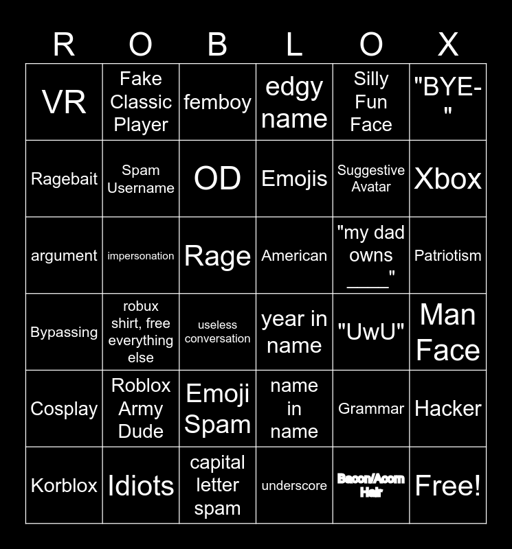 This bingo card has 42 words: Bacon/Acorn Hair, Spam Username, Sunscreen Eater, "my dad owns ____", Man Face, robux shirt, free everything else, argument, furry, femboy, Patriotism, Rage, Emojis, Xbox, Silly Fun Face, Idiots, Bypassing, Hacker, Suggestive Avatar, Free!, Fake Classic Player, "BYE-", Emoji Spam, Cosplay, VR, Headless, Korblox, OD, Troll, Roblox Army Dude, Grammar, /e dance, American, Ragebait, "UwU", capital letter spam, useless conversation, year in name, impersonation, name in name, underscore, edgy name and Country in name.