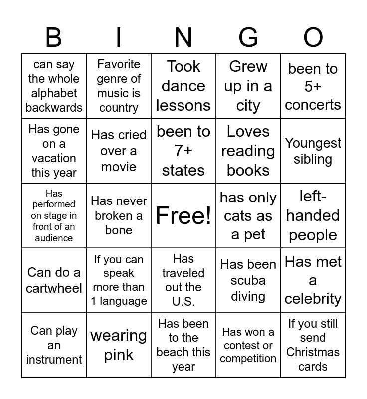 This bingo card has a free space and 24 words: If you can speak more than 1 language, wearing pink, been to 7+ states, Can play an instrument, been to 5+ concerts, can say the whole alphabet backwards, Has gone on a vacation this year, Favorite genre of music is country, has only cats as a pet, Has traveled out the U.S., Loves reading books, Has performed on stage in front of an audience, Has been scuba diving, Has met a celebrity, Has cried over a movie, Has won a contest or competition, left-handed people, Took dance lessons, Youngest sibling, Has never broken a bone, If you still send Christmas cards, Can do a cartwheel, Grew up in a city and Has been to the beach this year.
