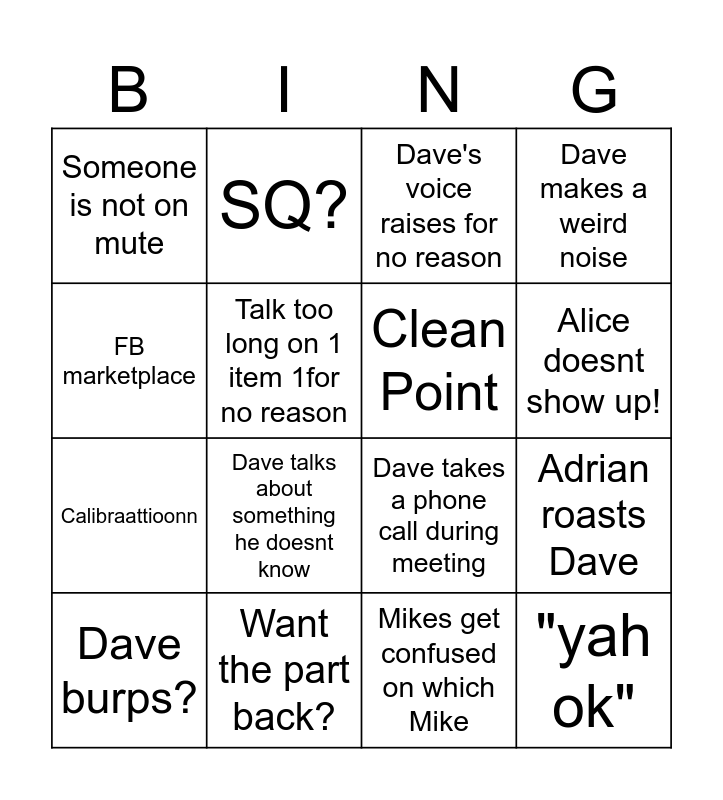 This bingo card has 18 words: Dave talks about something he doesnt know, "yah ok", Dave's voice raises for no reason, Someone is not on mute, Dave takes a phone call during meeting, Dave makes a weird noise, Dave burps?, SQ?, Alice doesnt show up!, Calibraattioonn, Mikes get confused on which Mike, FB marketplace, Adrian roasts Dave, Talk too long on 1 item 1for no reason, Clean Point, Oh shiit, Want the part back? and SCCM part.