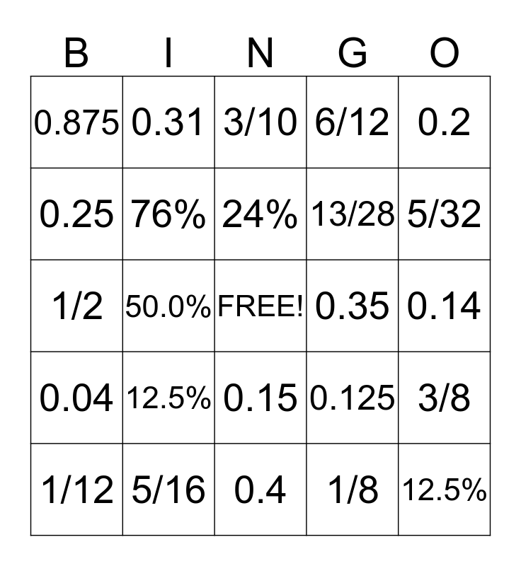 This bingo card has a free space and 24 words: 12.5%, 5/16, 24%, 1/12, 0.2, 0.875, 0.25, 0.31, 0.35, 0.15, 13/28, 1/2, 0.125, 3/8, 76%, 1/8, 0.14, 3/10, 5/32, 50.0%, 12.5%, 0.04, 6/12 and 0.4.