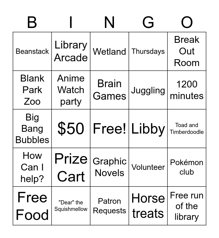This bingo card has a free space and 30 words: "Dear" the Squishmellow, Horseback riding, $50, log reading, Beanstack, Wetland, Anime Watch party, Graphic Novels, Libby, Patron Requests, Toad and Timberdoodle, Free run of the library, Horse treats, New bike, 1200 minutes, 600 Minutes, Volunteer, How Can I help?, Prize Cart, Break Out Room, Big Bang Bubbles, Friendship bracelets, Library Arcade, Juggling, Blank Park Zoo, Thursdays, Pokémon club, Free Food, Brain Games and Jefferson County Park.