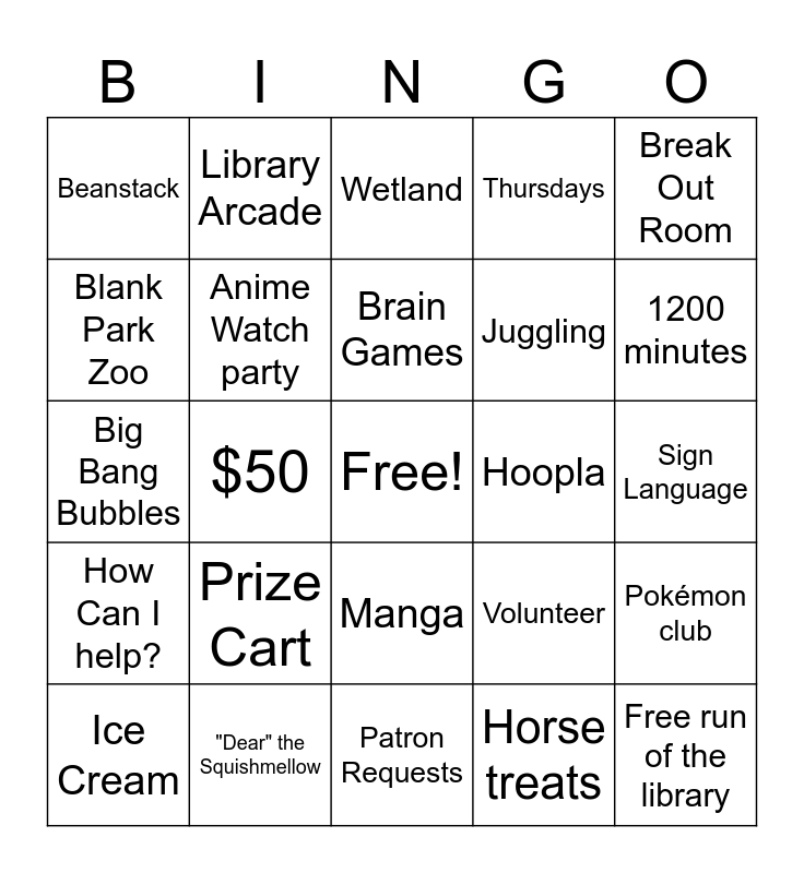This bingo card has a free space and 30 words: "Dear" the Squishmellow, Horseback riding, $50, log reading, Beanstack, Wetland, Anime Watch party, Manga, Hoopla, Patron Requests, Sign Language, Free run of the library, Horse treats, New bike, 1200 minutes, 600 Minutes, Volunteer, How Can I help?, Prize Cart, Break Out Room, Big Bang Bubbles, Friendship Bracelets, Library Arcade, Juggling, Blank Park Zoo, Thursdays, Pokémon club, Ice Cream, Brain Games and Jefferson County Park.