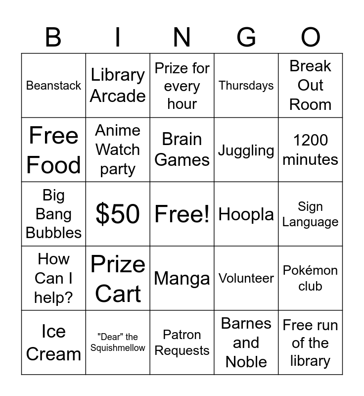 This bingo card has a free space and 30 words: "Dear" the Squishmellow, Horseback riding, $50, log reading, Beanstack, Prize for every hour, Anime Watch party, Manga, Hoopla, Patron Requests, Sign Language, Free run of the library, Barnes and Noble, New bike, 1200 minutes, 600 Minutes, Volunteer, How Can I help?, Prize Cart, Break Out Room, Big Bang Bubbles, Friendship Bracelets, Library Arcade, Juggling, Free Food, Thursdays, Pokémon club, Ice Cream, Brain Games and Jefferson County Park.