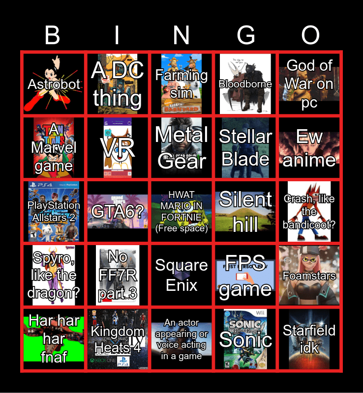 This bingo card has 24 images, a free space and 24 words: No FF7R part 3, Kingdom Heats 4, Metal Gear, Har har har fnaf, God of War on pc, Astrobot, A Marvel game, A DC thing, Silent hill, Square Enix, Stellar Blade, PlayStation Allstars 2, FPS game, Foamstars, VR, Sonic, Crash, like the bandicoot?, Farming sim, Ew anime, GTA6?, Starfield idk, Spyro, like the dragon?, Bloodborne and An actor appearing or voice acting in a game.