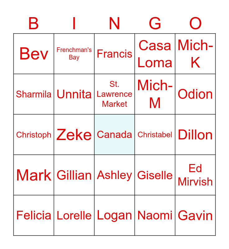 This bingo card has a free space and 29 words: Felicia, Ian, Zeke, James, Bev, Francis, Unnita, Gillian, Christabel, Lorelle, Dillon, Gavin, Logan, Naomi, Odion, Maria, Ashley, Mark, Mich-K, Christoph, Giselle, Shelton, Mich-M, Sharmila, Casa Loma, Frenchman's Bay, Ed Mirvish, St. Lawrence Market and Pickering City Centre.
