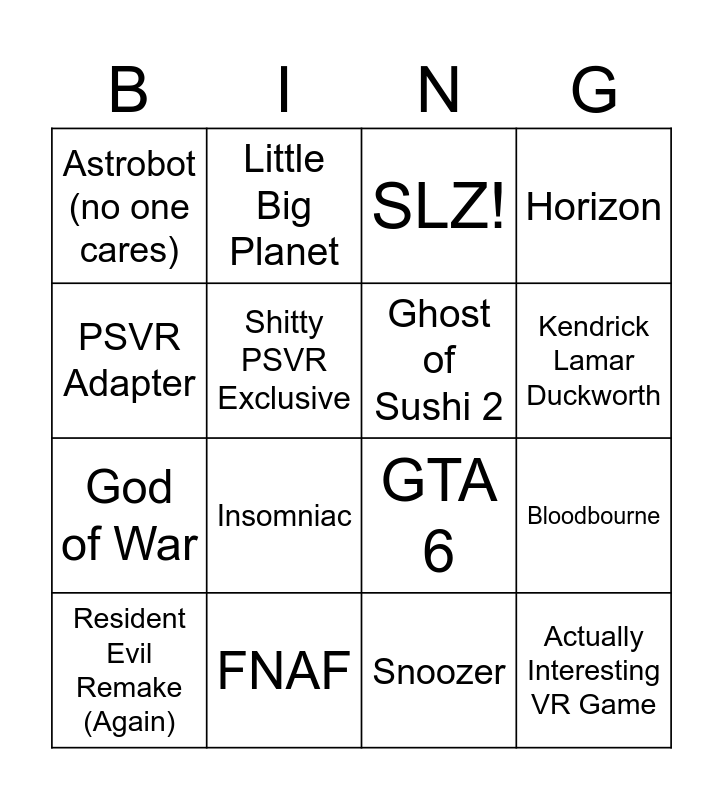 This bingo card has 16 words: FNAF, Bloodbourne, SLZ!, Astrobot (no one cares), God of War, Little Big Planet, GTA 6, Snoozer, PSVR Adapter, Shitty PSVR Exclusive, Resident Evil Remake (Again), Horizon, Insomniac, Kendrick Lamar Duckworth, Ghost of Sushi 2 and Actually Interesting VR Game.