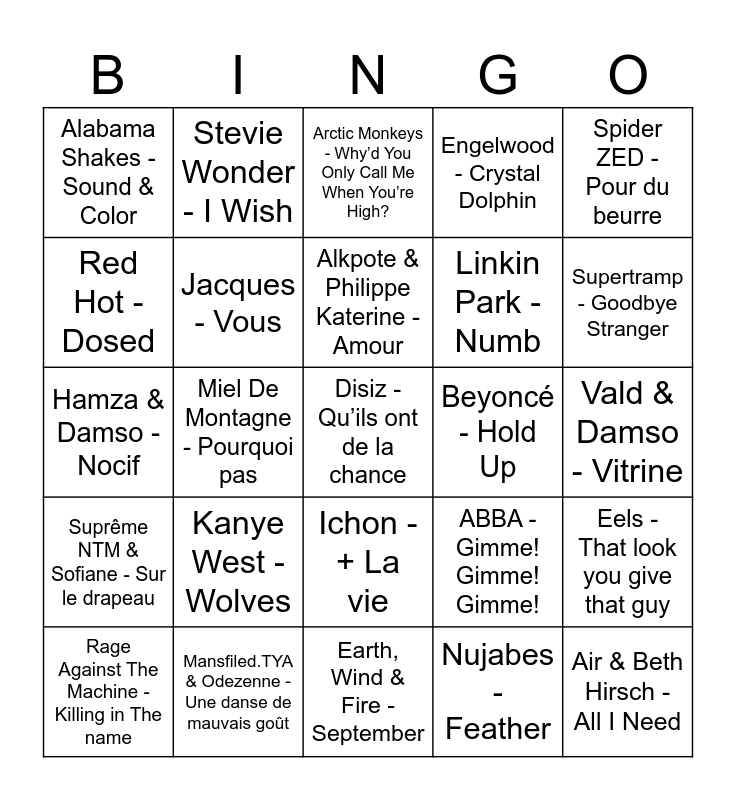 This bingo card has 40 words: Dua Lipa - Houdini, Hamza & Damso - Nocif, Jul - Pic et pic, alcool et drame, Jacques - Vous, Mansfiled.TYA & Odezenne - Une danse de mauvais goût, Ichon - + La vie, Alkpote & Philippe Katerine - Amour, Luidji - Gisèle Part 4, Spider ZED - Pour du beurre, Suprême NTM & Sofiane - Sur le drapeau, Miel De Montagne - Pourquoi pas, Engelwood - Crystal Dolphin, Disiz - Qu’ils ont de la chance, Vald & Damso - Vitrine, Beyoncé - Hold Up, Kanye West - Wolves, Thundercat - Them Changes, Alabama Shakes - Sound & Color, Childish Gambino - Sober, Arctic Monkeys - Why’d You Only Call Me When You’re High?, Eels - That look you give that guy, Nujabes - Feather, Linkin Park - Numb, Red Hot - Dosed, OutKast - So Fresh, So Clean, Santana - Maria Maria, Duke Ellington - Take The « A » Train, JAY-Z - Hard Knock Life, Air & Beth Hirsch - All I Need, Snoop Dogg - Who Am I, IAM - Je danse le Mia, Rage Against The Machine - Killing in The name, France Gall - Ella, elle l’a, ABBA - Gimme! Gimme! Gimme!, Supertramp - Goodbye Stranger, Earth, Wind & Fire - September, Fleetwood Mac - The Chain, Dalida - Salma ya salama, Stevie Wonder - I Wish and Stan Getz & João Gilberto - The girl from Ipanema.