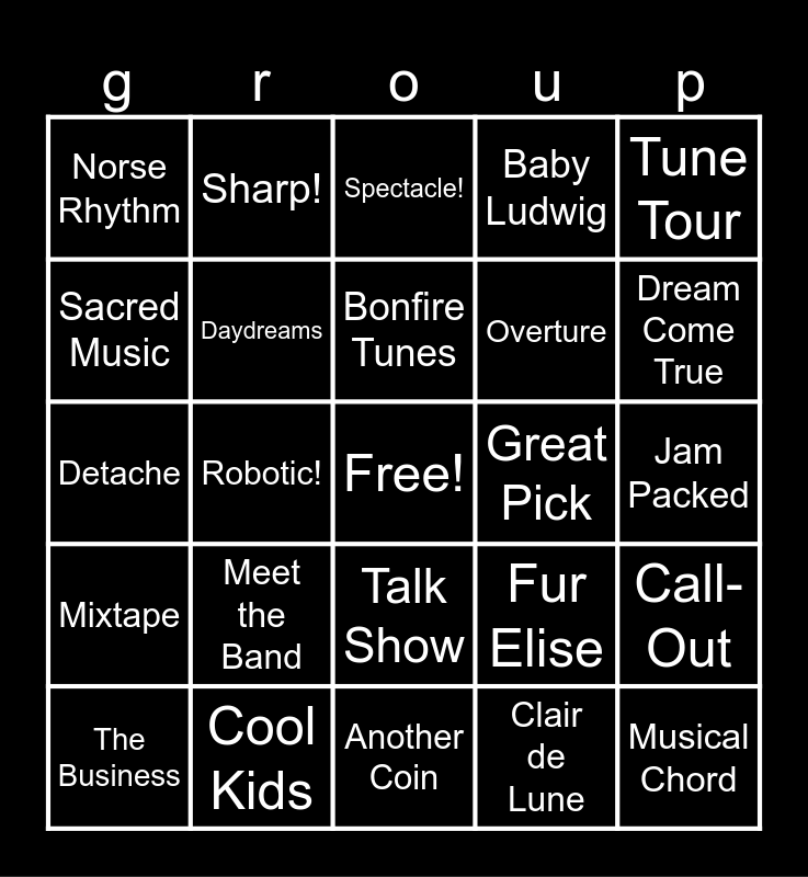 This bingo card has a free space and 104 words: Melody Lane, Big Piano!, Tune Tour, Tubad!, Can’t Beat It, Mewsic, Off-Kilter, Gong Pals, A Natural, Got The Role, My Forte, Arpeggios, Rehearsal, Mic Check, Sew Cute, Opening Night, Spectacle!, Curtain Call, All That Jazz, Star Employee, Jazz It Up, A Song to Sing, Stage Dream, Solo Serenade, A Star Is Born, Meet the Band, Dream Come True, Baby Ludwig, Young Promise, #1 Fan, Fur Elise, Clair de Lune, Symphony, Resilience, Splendid!, Mr. Maestro, Melodic Legacy, Carpool!, Bonfire Tunes, Cool Kids, Proud Mom, Mixtape, National Notes, Sacred Music, First Dance, Norse Rhythm, Mexico Lindo, Musical Chord, Sitar Song, Play Together, Ocarina of Mogul, Edo Music, Ukelele Paradise, Chime Bells, Studio Sesh, Press Fun, New Drop, Cover Boys, Tycoon Stars, Talk Show, Jam Packed, Superfandom, Show Time!, Notes Avenue, Clean Routine!, Flute Magic, High Notes, Sharp!, Detache, Robotic!, Another Coin, Solid Design, Honky-Tonk, Western Star, Oh, Sheet!, Tycoon Hustle, Boogie Down, The Business, Pure Boredom, Tantalizing, One Day, Broom Rock, Daydreams, The Best Gift, Great Pick, Rockstar!, Breakdance, Set Practice, Hold On!, The Crew, The Moves, Beatboxer, Bucket Drums, Call-Out, Clean Win!, Theatre M, Orchestra, Overture, La Traviata, Madama Butterfly, La Boheme, The Barber of Seville, Royal Box and Ovazione.
