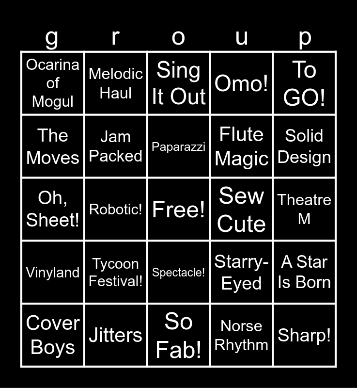 This bingo card has a free space and 189 words: Melody Lane, Big Piano!, Tune Tour, Tubad!, Can’t Beat It, Mewsic, Off-Kilter, Gong Pals, A Natural, Got The Role, My Forte, Arpeggios, Rehearsal, Mic Check, Sew Cute, Opening Night, Spectacle!, Curtain Call, All That Jazz, Star Employee, Jazz It Up, A Song to Sing, Stage Dream, Solo Serenade, A Star Is Born, Meet the Band, Dream Come True, Baby Ludwig, Young Promise, #1 Fan, Fur Elise, Clair de Lune, Symphony, Resilience, Splendid!, Mr. Maestro, Melodic Legacy, Carpool!, Bonfire Tunes, Cool Kids, Proud Mom, Mixtape, National Notes, Sacred Music, First Dance, Norse Rhythm, Mexico Lindo, Musical Chord, Sitar Song, Play Together, Ocarina of Mogul, Edo Music, Ukelele Paradise, Chime Bells, Studio Sesh, Press Fun, New Drop, Cover Boys, Tycoon Stars, Talk Show, Jam Packed, Superfandom, Show Time!, Notes Avenue, Clean Routine!, Flute Magic, High Notes, Sharp!, Detache, Robotic!, Don’t Fret, Drumroll, Tycoon Festival!, Selfie!, Rock On, Mosh Pit, To GO!, Glamping, Inkredible, Merch It!, Monopoly Tunes, Hay Girl, Saddle Up!, Pickin’ Girl, Steeled Lips, Country Call, Another Coin, Solid Design, Honky-Tonk, Western Star, Oh, Sheet!, Fiddlelity, Regal Concert, Bella Italia, Inspiration, Ingenious Work, Vibrato!, The Magic Flute, Making History, Jitters, It Girl!, Video Hit, Starry-Eyed, Lip-Sync, Ms Fever, Paparazzi, Devoted Fans, All In!, Stage Fright, Best Spot, The KJ, Sing It Out, Invested, Gentle Nudge, Set The Stage, Karaoke Dokey, Sweet Duets, Vinyland, Treasure Hunt, For The Record, Crate Digger, Special Request, Stereo-Types, Rare Find, Smash Hit, Happy Stroll, Got Served!, Pan-tastic!, Melody Blowing, Crystal Clear, Sweet Rhythm, Matching Songs, Shake It!, Washboard Tunes, Flutiful!, Trainees, Aegyo Merch, Omo!, The Debut!, Going Viral, Big Gig, We Did It!, Bias Wrecker, True Idols, Instrument Bliss, Triple Fret, Nose Notes, Hurdy Gurdy, Theremin, Kalimba, Glass Harmonica, Melodic Haul, New Hobby, 70s Vibes, So Fab!, Casanova, Don’t Wait Up, Cool Wagon, Funky Music, Groove On, Tycoon Hustle, Boogie Down, The Business, Pure Boredom, Tantalizing, One Day, Broom Rock, Daydreams, The Best Gift, Great Pick, Rockstar!, Breakdance, Set Practice, Hold On!, The Crew, The Moves, Beatboxer, Bucket Drums, Call-Out, Clean Win!, Theatre M, Orchestra, Overture, La Traviata, Madama Butterfly, La Boheme, The Barber of Seville, Royal Box and Ovazione.