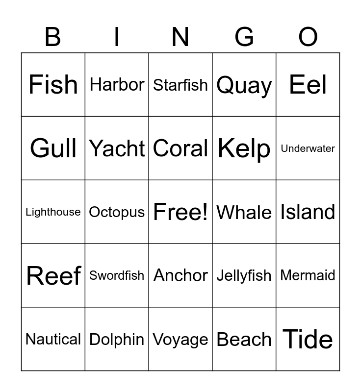 This bingo card has a free space and 26 words: Anchor, Beach, Coral, Dolphin, Eel, Fish, Gull, Harbor, Island, Jellyfish, Kelp, Lighthouse, Mermaid, Nautical, Octopus, Pirate, Quay, Reef, Starfish, Tide, Underwater, Voyage, Whale, Swordfish, Yacht and Zooplankton.