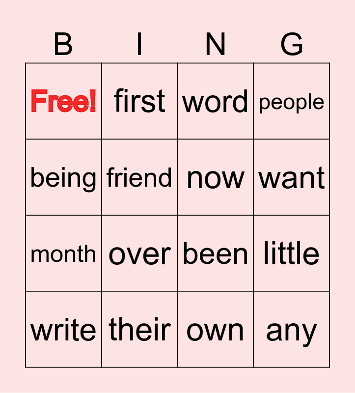 This bingo card has 16 words: write, their, word, people, being, first, been, little, Free!, friend, own, want, month, over, now and any.