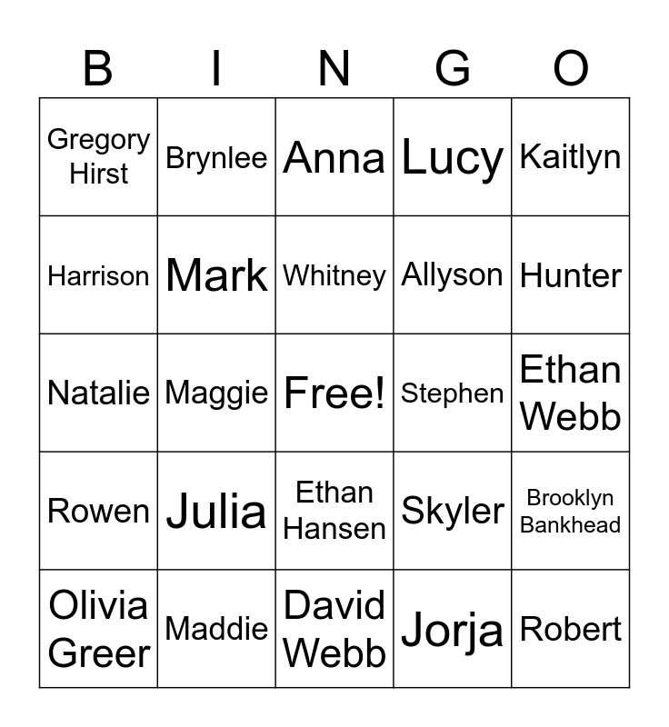 This bingo card has a free space and 68 words: Lorri, Robert, Brady, Shalece, Lincoln, Cassidy, Brynlee, Emily, Whitney, McKay, Ethan Hansen, Brooklyn Hansen, Ethan Webb, Kaitlyn, Cameron, Harrison, Maggie, Gregory Hirst, Brian, Julia, Allyson, Skyler, Rowen, Crew, Grayson, McKenzie, Sam, Olivia Bankhead, Brooklyn Bankhead, Gregory Webb, Anna, Erik, Ashley, Nathan, Lucy, Christopher, Logan, Olivia Greer, Hunter, Natalie, Grace, Sophia, Mark, Brooke, Maile, Jake, Emma, Janie, Stephen, Maddie, Lexie, Nikki, Jacob, David Webb, David Webb, Amber, Jorja, Adelle, Luke, Jack, Heber, Lyndsay, Chad, Kate, Rachel, Ben, Jeff and Liz.